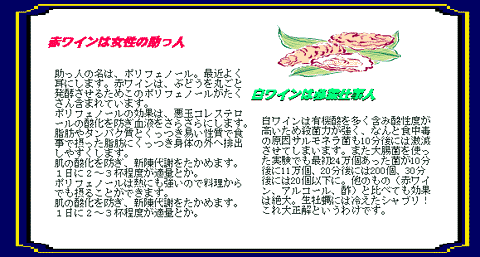 | 「♪金曜日はパン買って、花買って、ワインを買って帰りますぅ!♪」私が小学生の頃、TVコマーシャルで流れていたフレーズです。 ご存じの方もいらっしゃるのでは・・・!? あれから約四半世紀。今度は史上空前のワインブームがやってきました。 各国の美味しいワインが比較的手軽な値段で飲める様になり、輸入量も急増。 97年はなんと1億44万リットルも輸入され、96年と比べて38%も増加しているそうです。 一時騒がれたボジョレーヌーボーもそろそろ出番(11月の第3木曜/今年は11月19日)です。今回は、皆さんもよくご存じのワインについてお話します。 |
