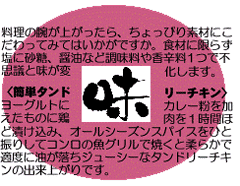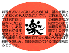 | 某化粧品メーカーの広告コピー「カッコイイおじさんになろう!」は、以前週刊誌に全12編のシリーズもので掲載。「カッコイイおじさん」を目指す男性へのメッセージが、掲載毎に1つ記載されていて、その中の1つに“男の料理”があげられていました。この広告に限らず近年、人気男性アイドルが出演し料理を作る番組は高視聴率を上げ、また書店では男性向けの料理本コーナーもみうけられる様になりました。男性の料理教室も大盛況で、受講者の主流は中高年の男性といいます。昔「会社人」今「社会人」男性自身が自立し、男らしさよりも自分らしさの意義を実感しているかもしれませんね。 |