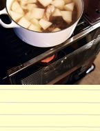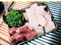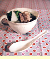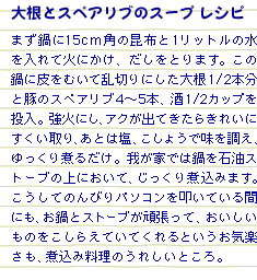 さて、今年はこの季節に備えて、フランスで造られている「ル・クルーゼ」というシリーズの鍋を買いました。ご存じの方も多いと思いますが、これがまたとてつもない重さ。買ったのは直径24cmなのですが、蓋と合わせると、持ち上げる時思わず「よいしょっ!」と声がでてしまうような代物です。でもいかにも、「おいしいもの?もう、まっかせてくださいっ!」てな風情。料理心がうずうずします。そこで近所の八百屋さんに出かけたところ…。ありましたありました。太くて真っ白、つややかな大根が。それから緑濃い春菊。ついでにお隣の肉屋さんで豚のスペアリブをゲット。これで準備は万端。ご紹介いたしますのは、「大根とスペアリブのスープ」です。