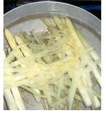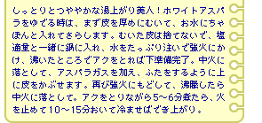 ほのかに湯気をまとい、淡い春の光を映して輝くその裸身。透き通るような肌は、まるでうら若き処女の如し。おもむろにナイフをすっと差し入れると、かすかな抵抗を見せながらも、さくぅりと切れ、断面からは、しるしるとしたたる雫。んふっふ。よいではないか、よいではないか。されば口に含むと…。すがすがしい苦みと春の香りが駆けめぐります。