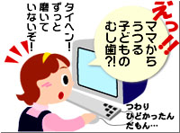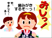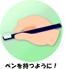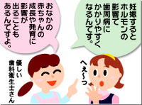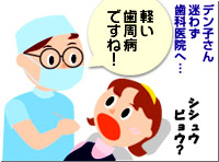 最近インターネットをはじめたデン子さん。ただ今妊娠5ヶ月です。 先月くらいまで、つわりがひどくて、歯磨きが大変でした。その上、毎回出血しているみたい。ちょっぴり不安になっていました。だけど、子供の頃、虫歯で辛い思いをして以来、歯医者は嫌い! このまま、ほっといて大丈夫かな? そんなある日、「でんたるらんど」ホームページの「第1回 ママのおなかにいる頃」を読みました。 『ママのお口のバイ菌が原因で、子供の虫歯ができます。』・・・これはビックリ! デン子さんは、さっそく歯科医院へ検診に出かけました。 待合室では緊張して、気分が悪くなりそうでしたが、それこそ「案ずるより産むが安し」。 優しそうな先生と、衛生士さんが、手際よく検査を済ませ、状況を説明してくれました。 『虫歯はありませんが、軽い歯周病になっていますよ.』・・・虫歯がなくって良かった。 『妊娠すると、ホルモンの影響で、歯周病にかかりやすくなるのです。』 ・・・へぇ〜 『最近の研究で、歯周病は、低体重児出産の確率を高めることがわかってきました。』 ・・・これには、またまたビックリ! 『私達がサポートいたしますので、毎日のプラークコントロール、頑張ってくださいね』 ・・・はい、よろしくお願いします。 プロケアを受けて、ホームケアの方法を習って、帰ってきました。 「よぉ〜し、今日から頑張るぞ!」 歯ブラシを持つ手に、気合が入るデン子さんでした。 ・・・え〜と、気合は入れても、力を入れずに、ペンを持つように、この角度でネ! つづく |