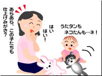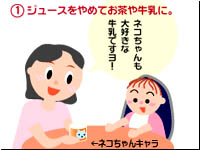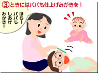 ユキちゃんはママにしがみついて離れられません。結局泣き出してしまいました。ア〜ンと泣いてる間に、先生が覗き込んでチェックを済ませました。 『この時期の虫歯は、食習慣からの影響が大きいといわれています。ご自宅での様子を詳しくお聞きして、お口の環境を切り替える糸口を見つけましょう』 サキ江さんは、衛生士さんと話し合い、さっそく自宅で取り掛かれそうな事を、虫歯予防プログラムとして挙げてみました。 1) 常備していたジュースを、お茶や牛乳に切り替えてゆく。 特に、お休み前にストローボトルに入れてあげていた習慣を、早急に改善すること。 2) おやつの時間を決めて、その時間を親子で楽しめるように工夫する。 今、お出かけバックの中に入っているアメは、代用甘味料仕様にかえておいて、必要性がだんだん薄れるように、気を紛らしてあげること。 3) 家族が、楽しそうに時間をかけて歯磨きしているところを見せる。 時には、ママがパパの仕上げ磨きを膝枕でしてみせること。 「いや〜スッキリした!」って、パパにも演技協力をお願いする。 |